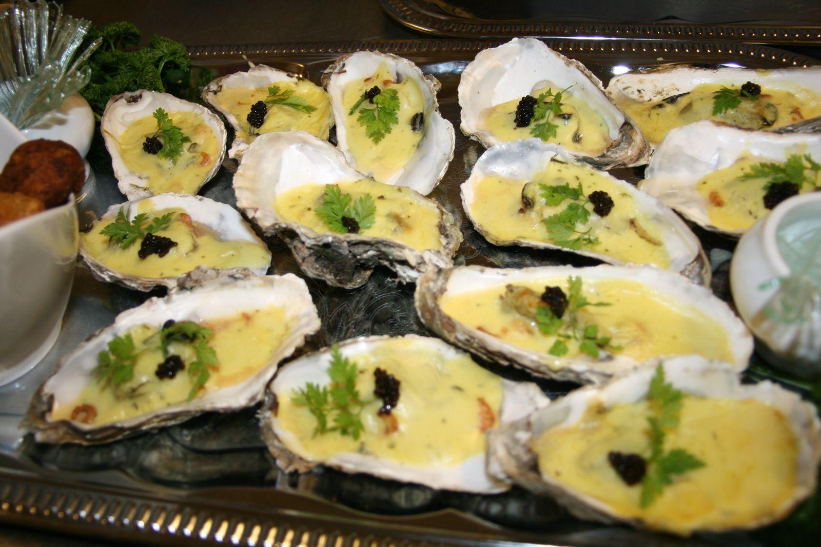 Een elegante en luxe delicatesse waarbij de pure zilte smaak van de oester wordt verrijkt met een gouden topping op basis van champagne , room en oestervocht.